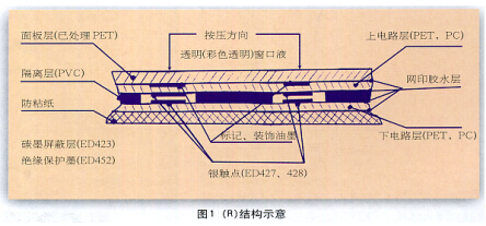 薄膜開(kāi)關(guān)兼有面板和開(kāi)關(guān)的雙重作用 且開(kāi)關(guān)動(dòng)作行程短 大概為 0.25 ~0.5 mm薄膜開(kāi)關(guān)按壓力為 0.5 ~ 1 N 用手輕觸就能完成開(kāi)關(guān)作用 同時(shí)具有密封性 防塵性好 所以廣泛應(yīng)用在洗衣機(jī)的控制面板 微波爐的操作面板以及電子產(chǎn)品中 根據(jù)這些產(chǎn)品結(jié)構(gòu)需要 薄膜開(kāi)關(guān)的結(jié)構(gòu)有多種形式 但目前較普通的是( R ) 結(jié)構(gòu)( 如圖1).